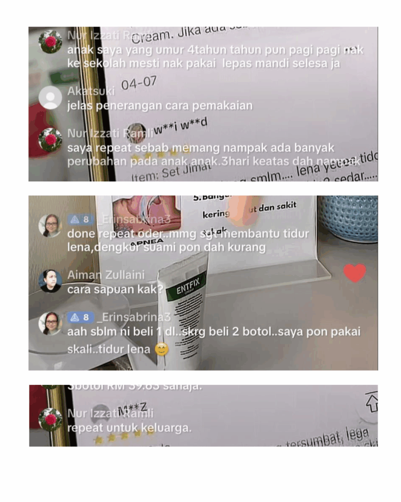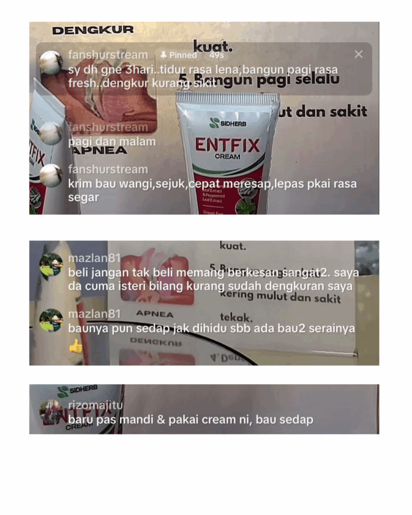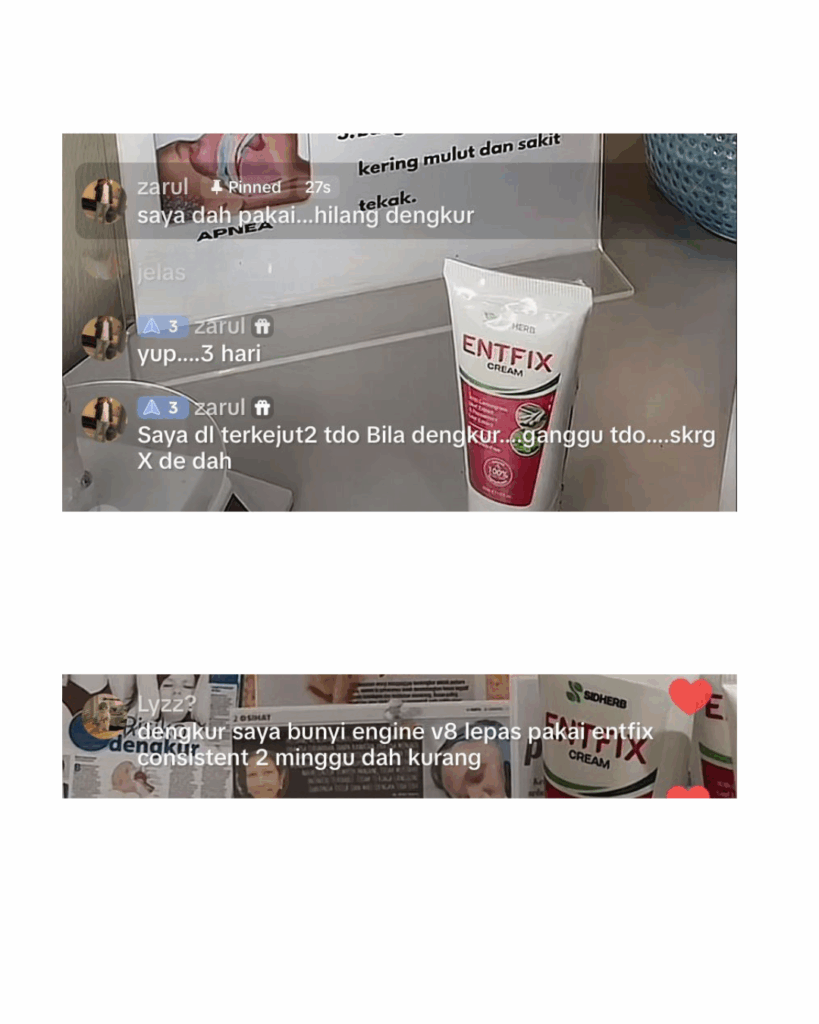 “Entfix Cream telah membantu ramai individu mengatasi masalah dengkur. Baca kisah mereka dan lihat sendiri perubahan yang mereka alami.”